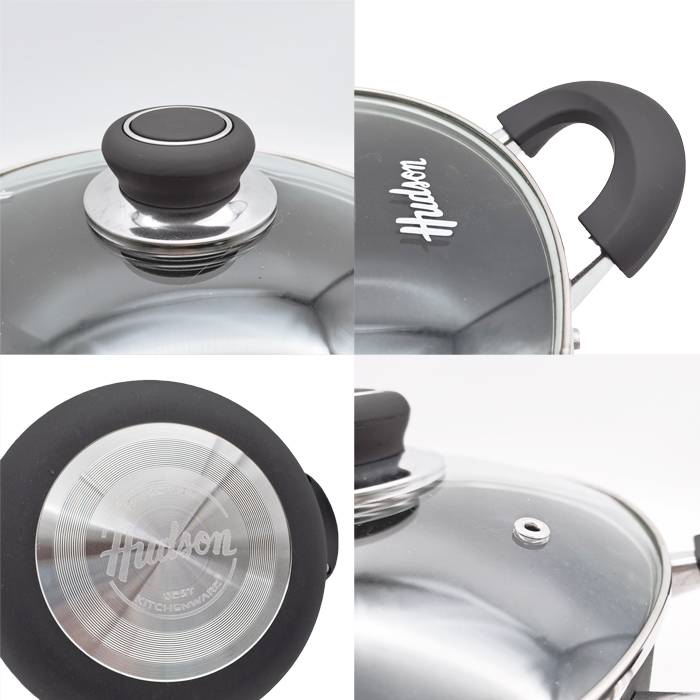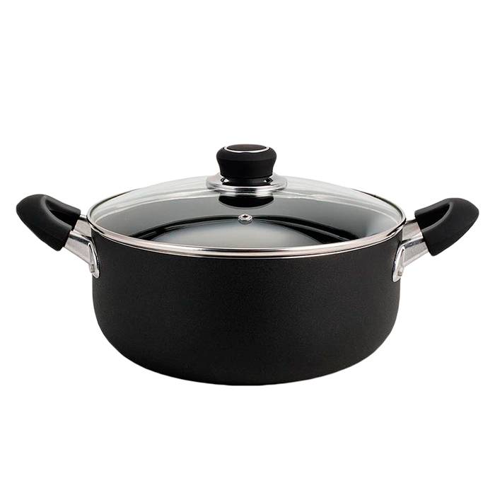 Cacerola de aluminio con capa antiadherente, tapa de vidrio templado con valvula de vapor y asas soft touch color negro.