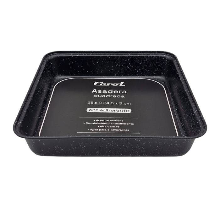 Asadera cuadrada de acero carbono con antiadherente.Línea Granito Negro.Medidas:Ancho: 25 x 24,5 cm.Alto: 5 cm.Apto horno a gas y eléctrico. Apto lavavajillas y freezer.