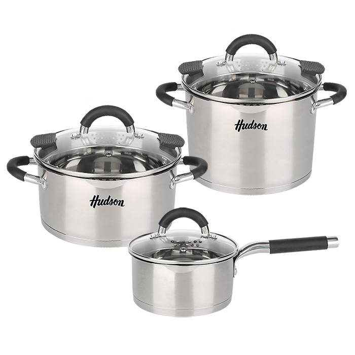 Incluye: Cacerola de Ø24 cm con tapa de vidrio, Cacerola de Ø20 cm con tapa de vidrio y Cacerola de Ø16 con mango y tapa de vidrio.