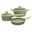Incluye Cacerola de 24cm, cacerola con mango de 18cm y sartén de 24cm. Además 2 pot mats (lienzos separadores) de 33cm y 1 ayudante de cocina de silicona.