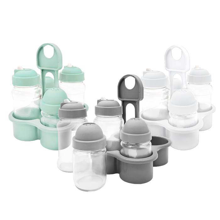 Set de Condimentos para Ensaladas: Frascos para Aceite, Vinagre, Sal y Pimienta.
