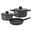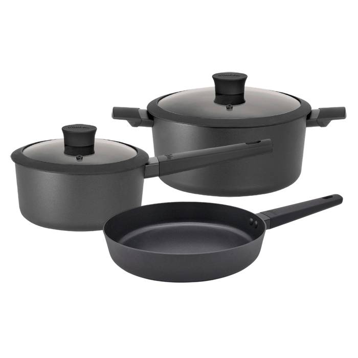 Incluye Cacerola de 24cm, cacerola con mango de 18cm y sartén de 24cm. Además 2 pot mats (lienzos separadores) de 33cm y 1 ayudante de cocina de silicona.