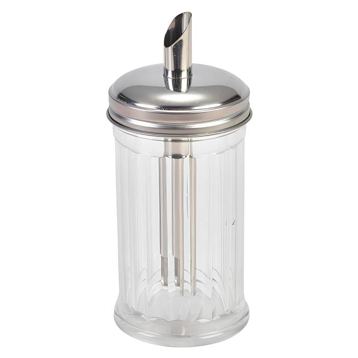 Azucarera de vidrio con tapa y pico vertedor de acero.