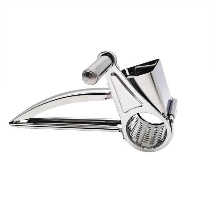 Rallador de queso manual con sistema rotativo de acero inoxidable.