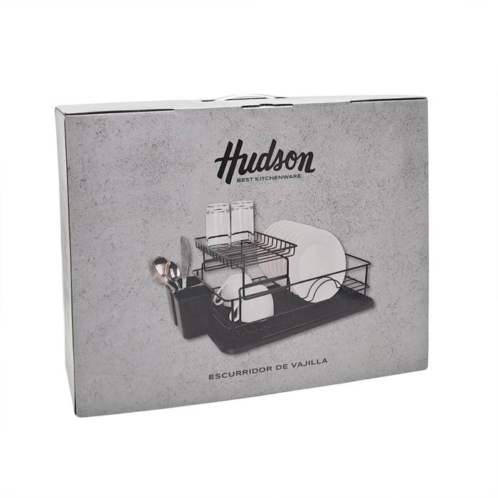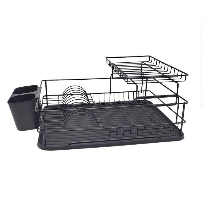 Escurridor de platos de acero negro de 2 pisos con bandeja plástica y cubertero.