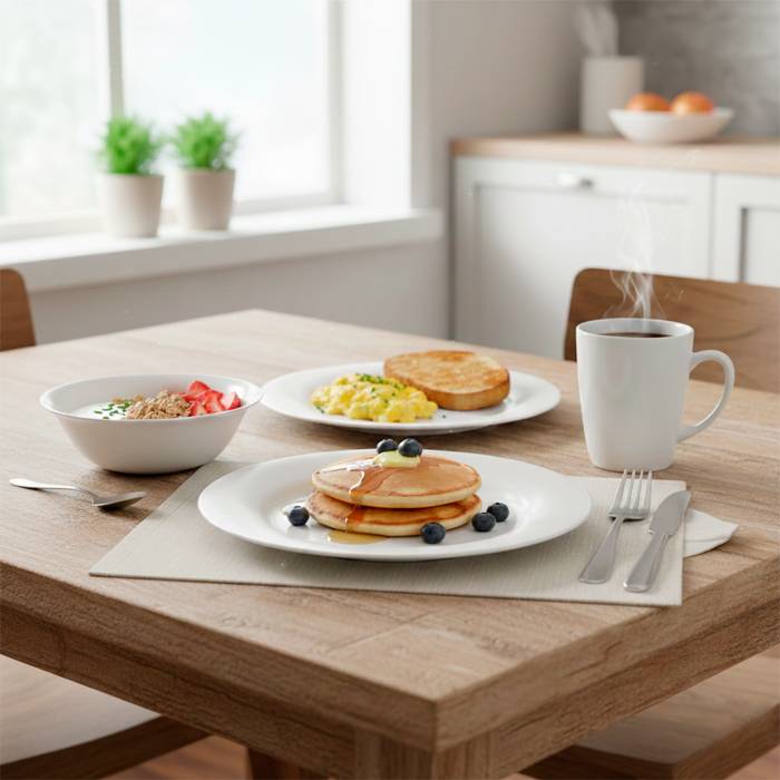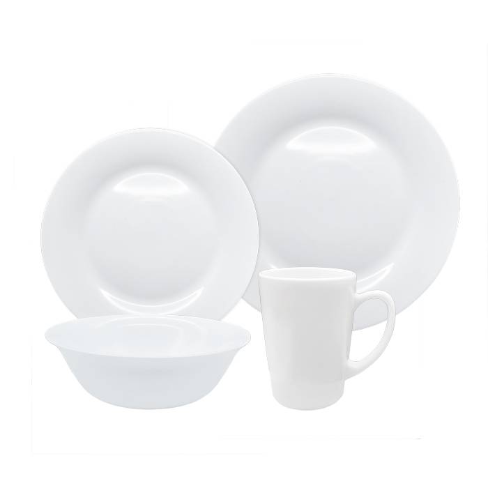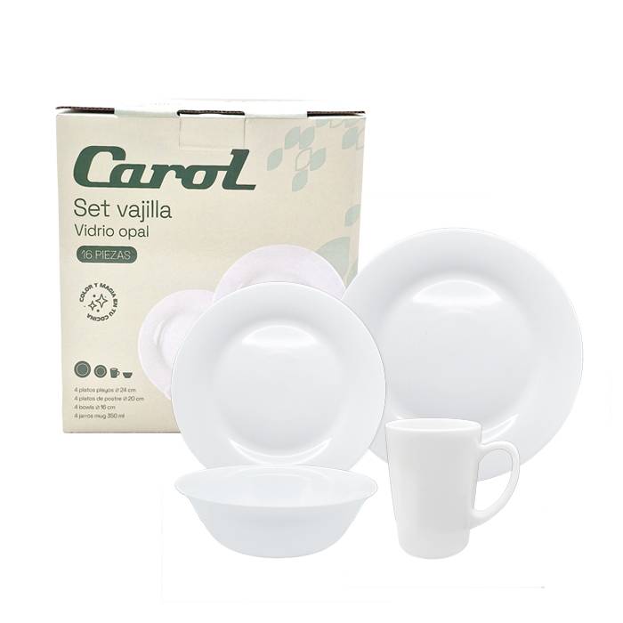 Línea redonda.Incluye:4 Platos Playos de 24 cm.4 Platos Postre de 20 cm.4 Bowls de 16 cm.4 Jarros de 350cc.En caja.Apto microondas y lavavajillas.