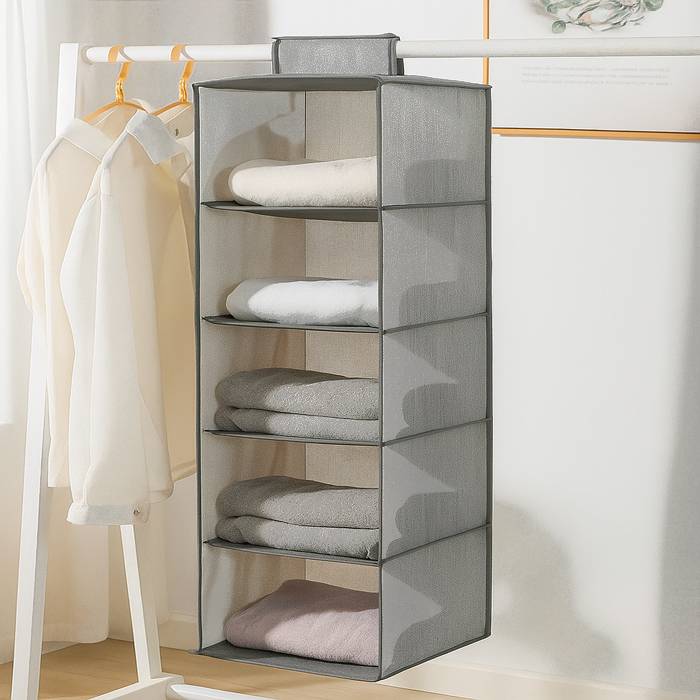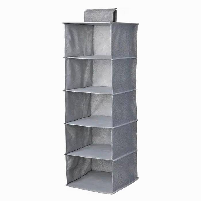 Organizador de tela plegable con 5 estantes, con estructura semi rígida. Para colgar en barral. Anti hongos.
