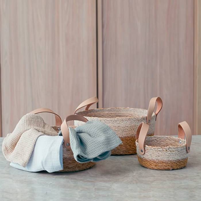 Set x 3 canastas redondas bicolor de fibra natural simil mimbre con asas de cuerina.
