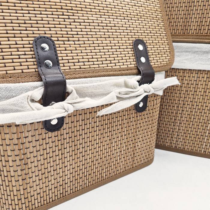Set de 3 Canastos de Bambu con tapa, con interior de tela y bisagras de eco cuero con remaches.