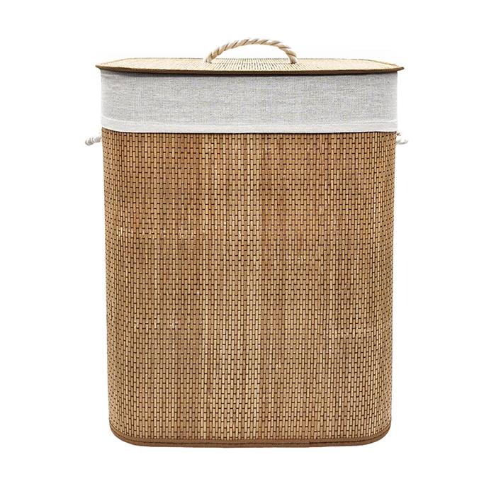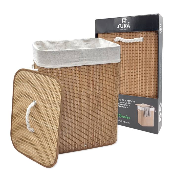 Canasto de bamboo cuadrado con tapa, cuerdas de agarrey funda de tela removibleMedidas:Alto: 50 cmAncho: 40 cmLargo: 30 cmCapacidad: 60 lts.