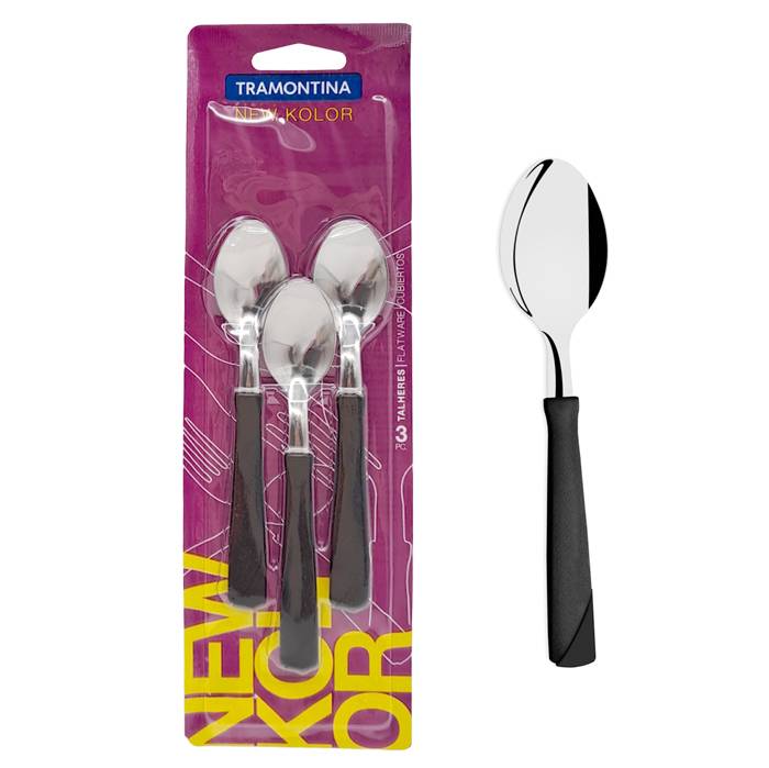 Cucharas de té de Acero con Mango Polipropileno Negro.Blister x 3 unidadesMedidas:Largo total: 18,6 cm.Largo mango: 10 cm.Ancho: 3,9 cm.Alto: 1,8 cm.Apto Lavavajillas.