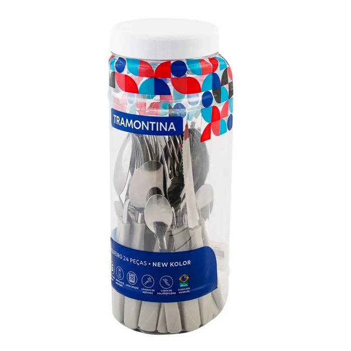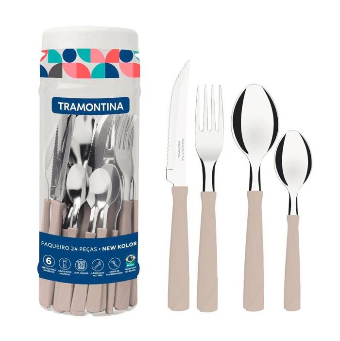 Juego x 24 Cubiertos de acero inoxidable y mangos de Polipropileno.Linea New Kolor, en Pote con rosca.Color: TizaIncluye:6 - Cuchillos de 4'' (20 cm)6 - Tenedores (18,5 cm)6 - Cucharas (18,5 cm)6 - Cucharas de té (13,5 cm).