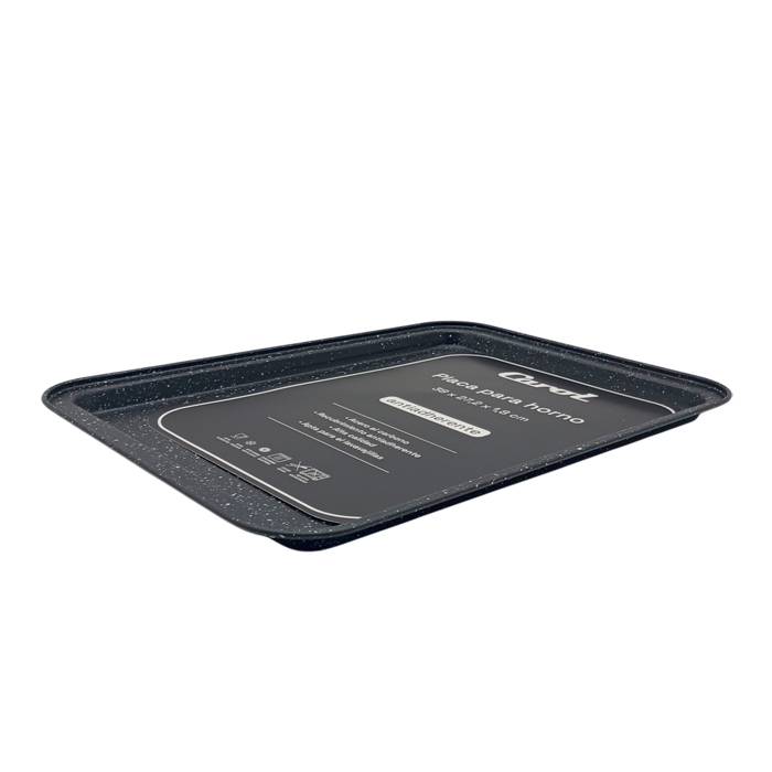 Placa rectangular de acero carbono con recubrimiento antiadherenteLinea Granito NegroMedidas:Largo: 38 cmAncho: 27,2 cmAlto: 1,8 cmApto horno a gas y eléctrico. Apto lavavajillas y freezer.